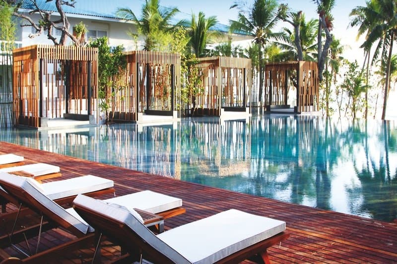 Highlight: Jedes Zimmer hat einen eigenen Pool mit Tagesbett auf einer Holzterrasse.